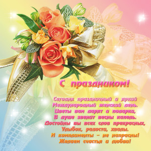Оригинальные картинки со стихами и красивые открытки с 8 марта. - поздравительные открытки любимым женщинам и девушкам. Анимационные и блестящие открытки поздравления на 8 марта прекрасной половине человечества в Международный Женский День. Большая коллекция красивых поздравительных открыток с наступающим женским весенним днем для мамы, сестры, бабушки, подруг, сотрудниц и коллег. Поздравьте любимых женщин, подруг с весенним праздником 8 марта! Отправьте им поздравление по электронной почте или по телефону через Вайбер, Ватсап.