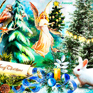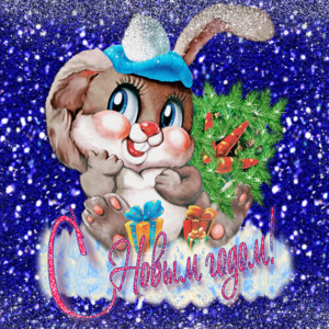 Поздравительная анимационная открытка с Новым годом кролика и кота
