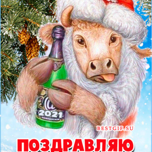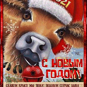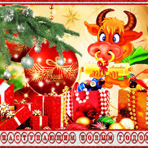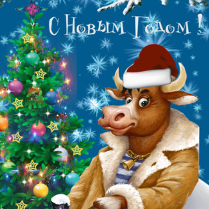 Бычок в красной шапочке с бубенчиком на шее и новогодними пожеланиями на год Быка.