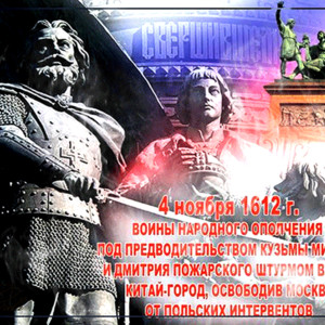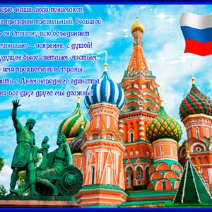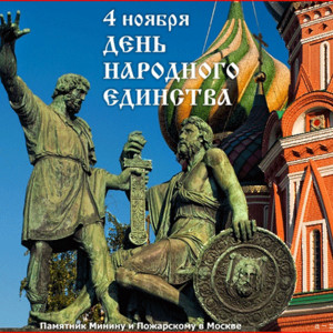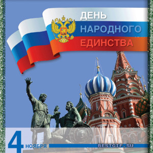 Поздравительные открытки и картинки с Днем Народного Единства. Государственный российский праздник День народного единства пришел на смену празднования годовщины Октябрьской революции 1917 года, отмечавшейся с СССР 7 ноября. Дата приурочена к взятию под предводительством Минина и Пожарского Китай-города в Москве в 1612 году.